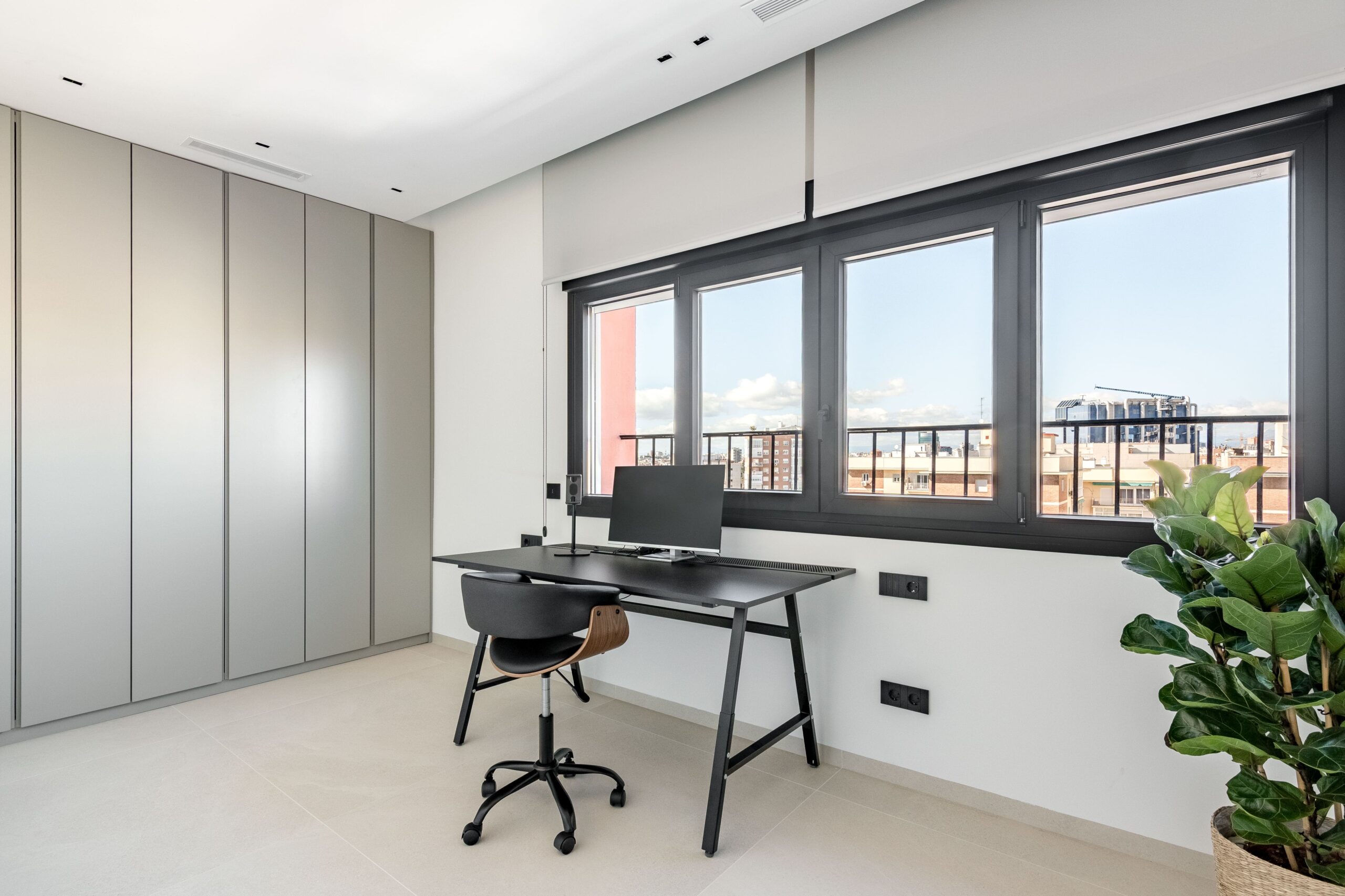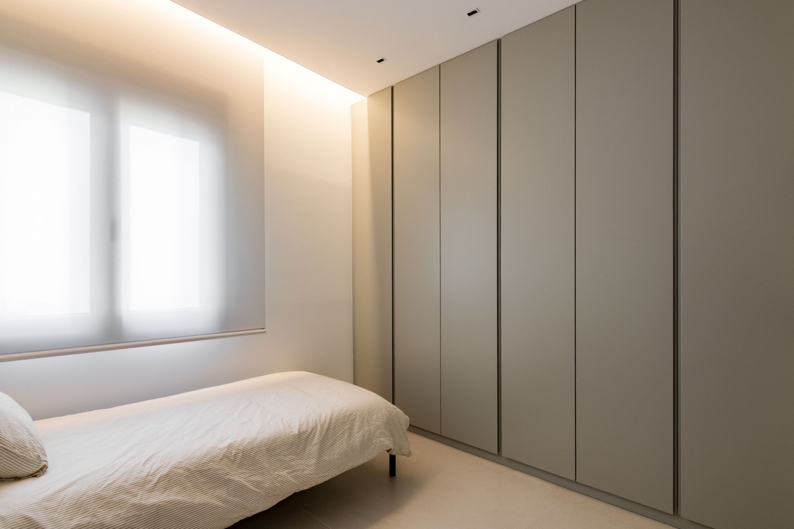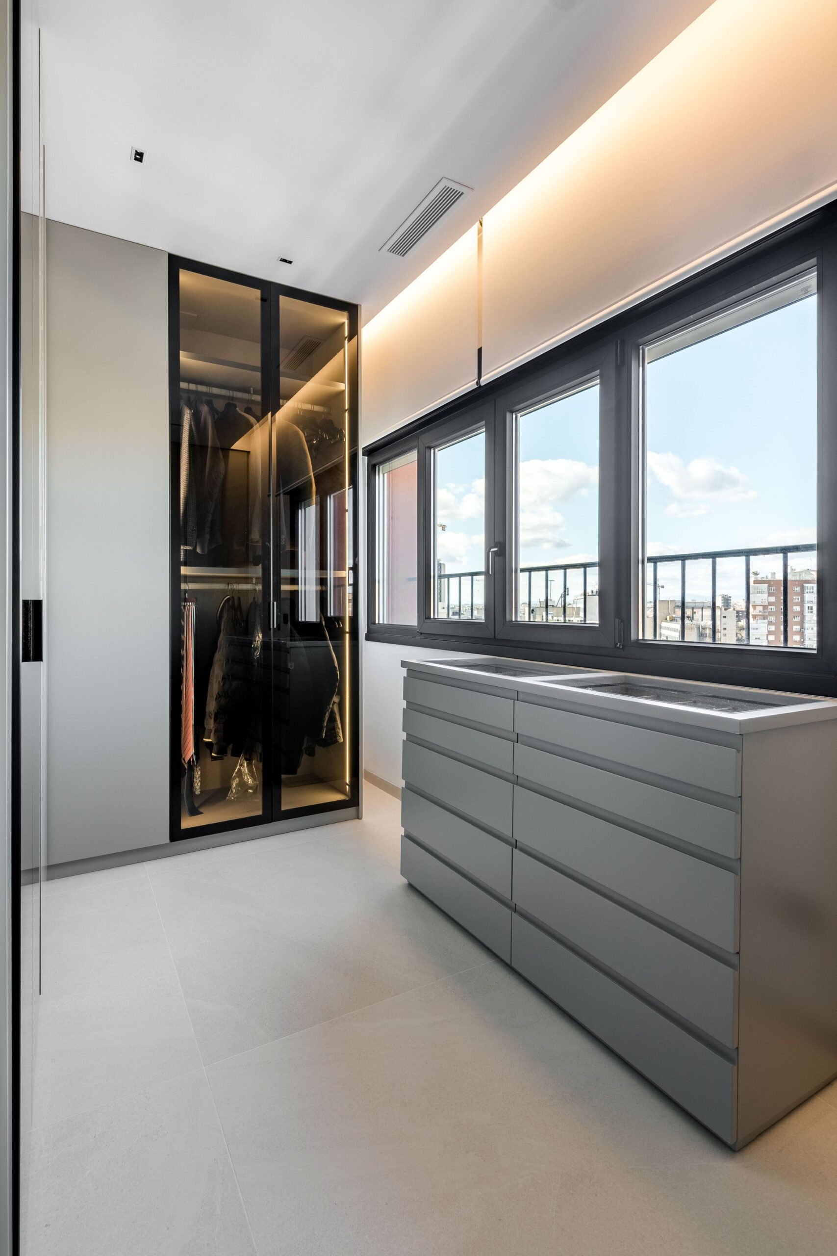 Ubicada en Madrid, esta vivienda ha sido diseñada para ofrecer una experiencia residencial contemporánea donde la arquitectura interior y la carpintería a medida son protagonistas. Desde la entrada, una elegante puerta pivotante marca el carácter exclusivo del inmueble, mientras que las puertas lacadas de suelo a techo, con bisagras ocultas y sin dinteles visibles, aportan continuidad visual y una estética limpia. El almacenamiento ha sido cuidadosamente integrado mediante amplios armarios y vestidores completamente vestidos en dormitorios, pasillos y recibidor, destacando un vestidor que combina puertas ocultas con elegantes frentes acristalados que permiten ver el interior. Los estores motorizados en los dormitorios completan un entorno funcional y sofisticado.