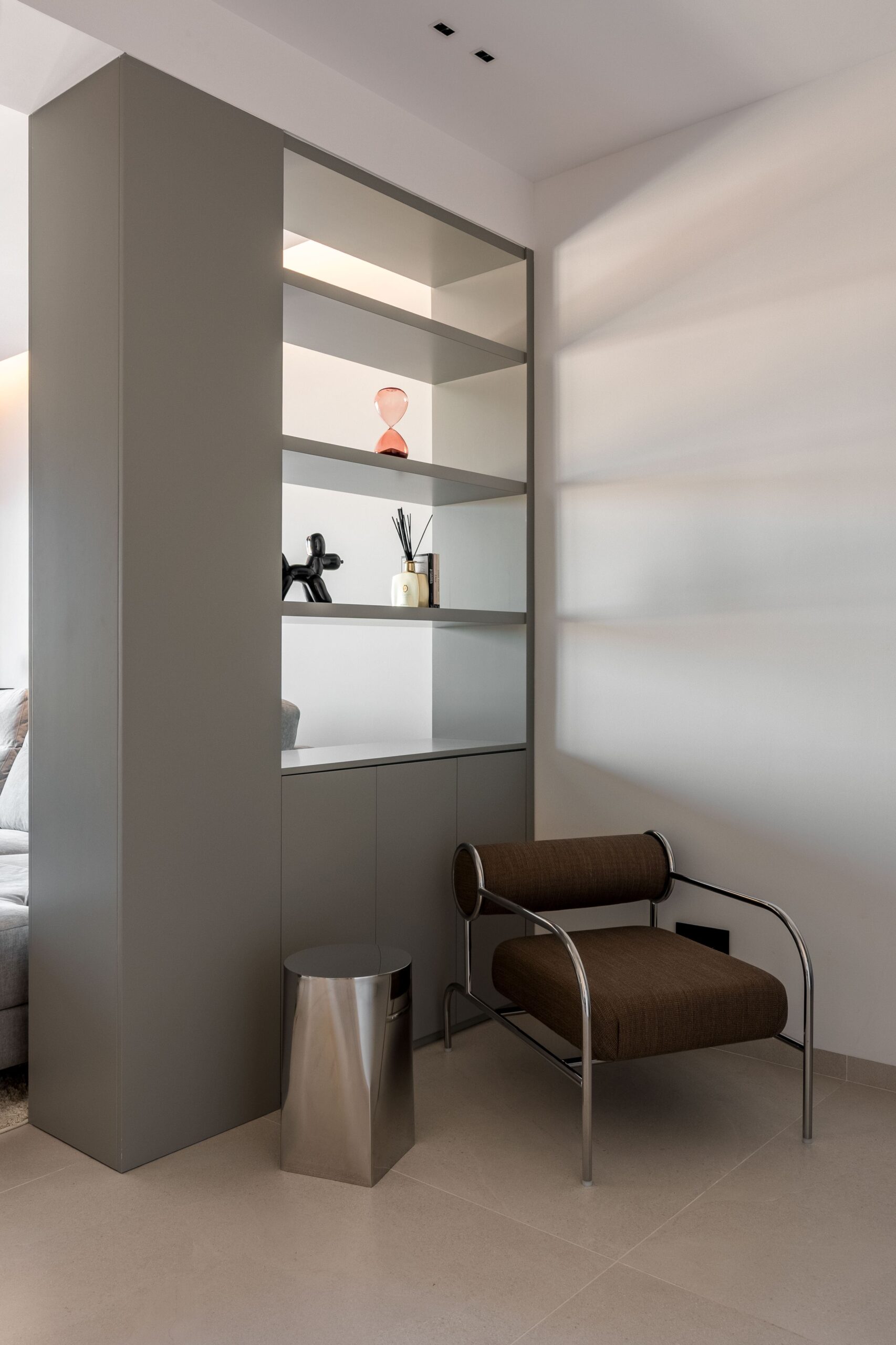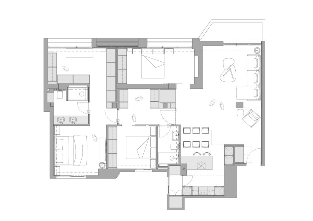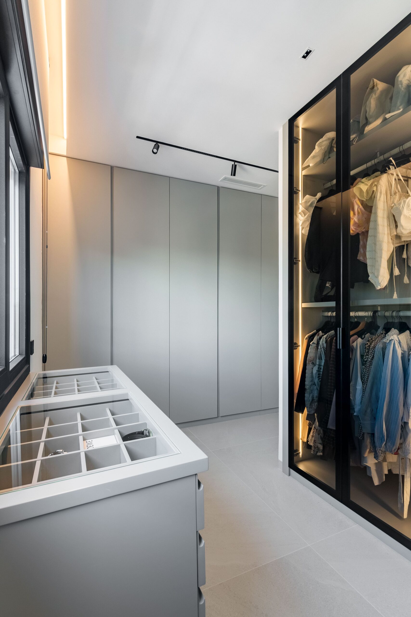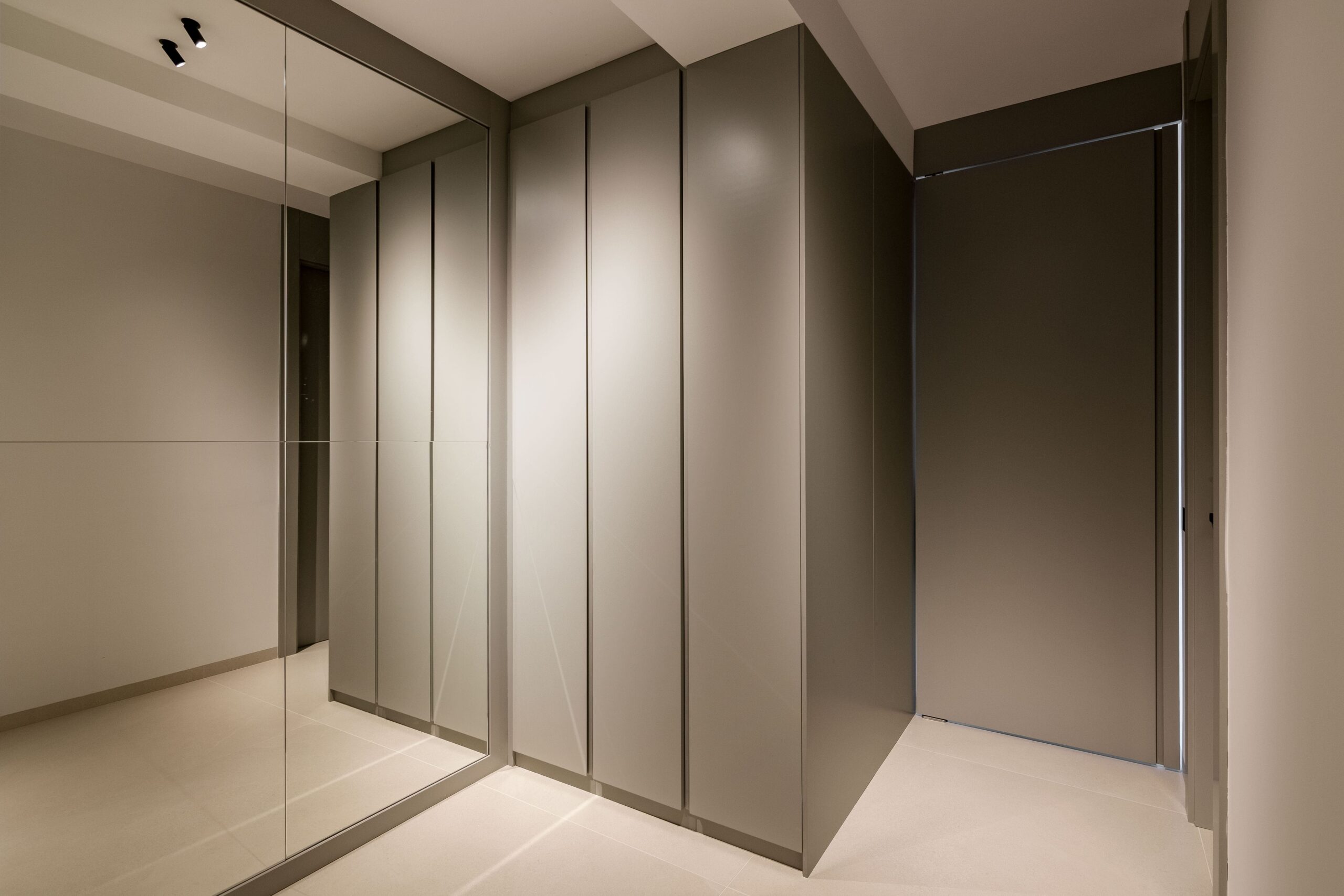Ubicada en Madrid, esta vivienda ha sido diseñada para ofrecer una experiencia residencial contemporánea donde la arquitectura interior y la carpintería a medida son protagonistas. Desde la entrada, una elegante puerta pivotante marca el carácter exclusivo del inmueble, mientras que las puertas lacadas de suelo a techo, con bisagras ocultas y sin dinteles visibles, aportan continuidad visual y una estética limpia. El almacenamiento ha sido cuidadosamente integrado mediante amplios armarios y vestidores completamente vestidos en dormitorios, pasillos y recibidor, destacando un vestidor que combina puertas ocultas con elegantes frentes acristalados que permiten ver el interior. Los estores motorizados en los dormitorios completan un entorno funcional y sofisticado.