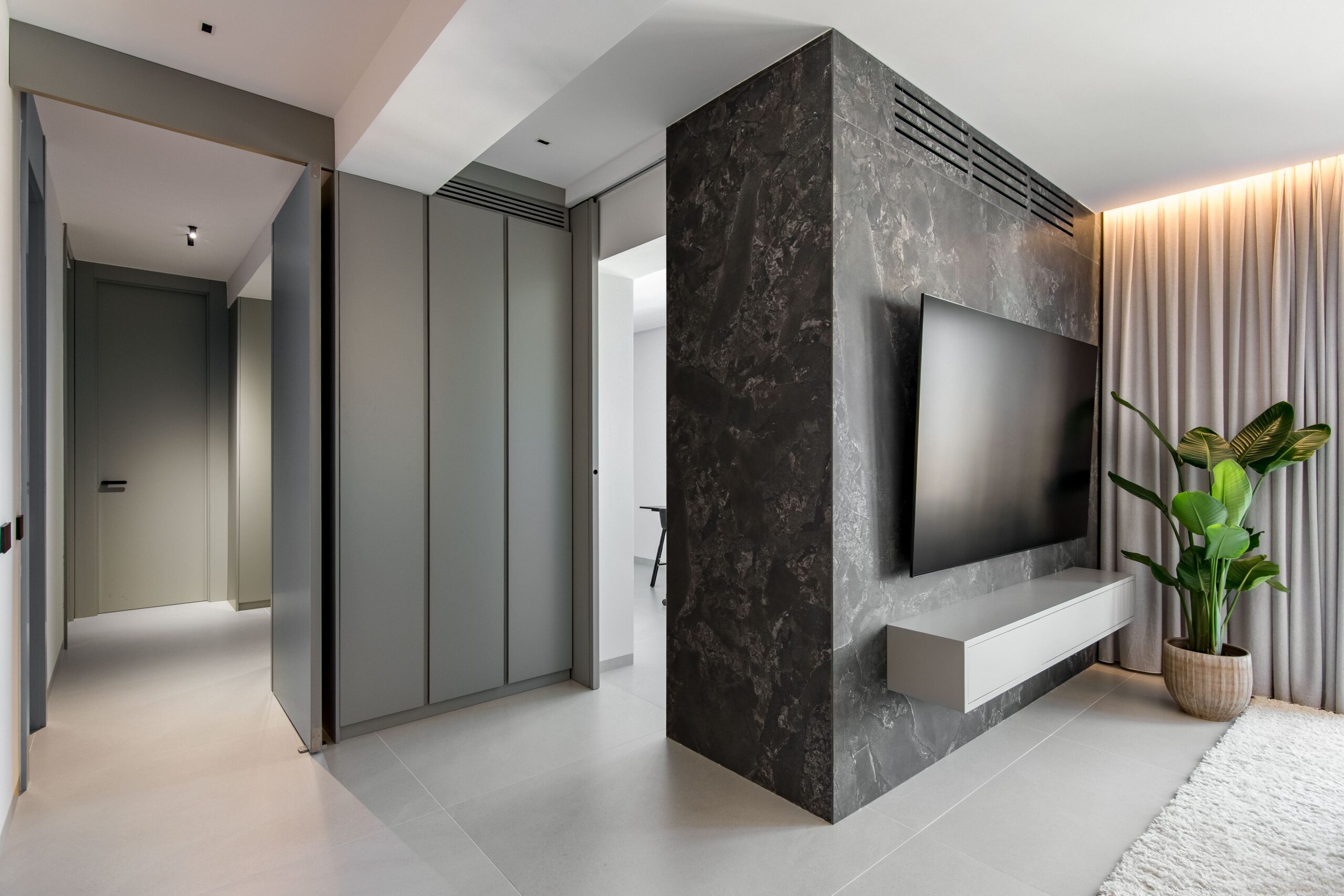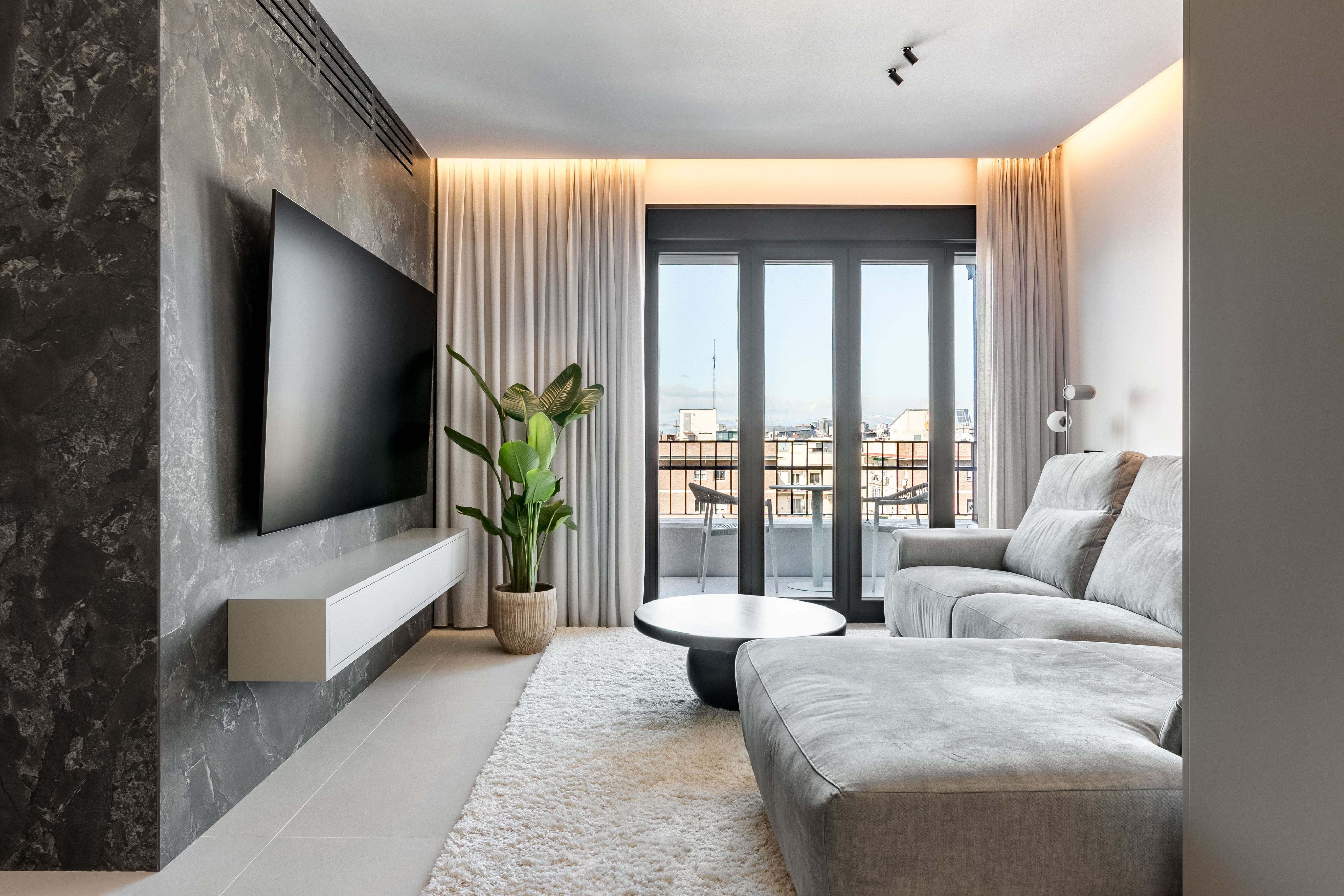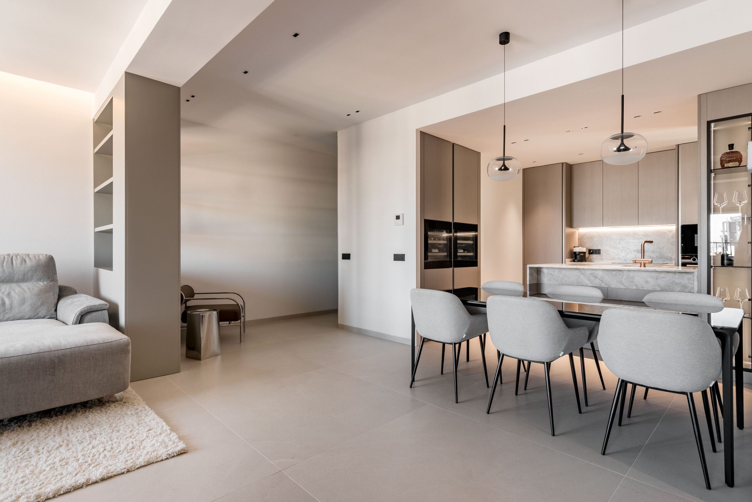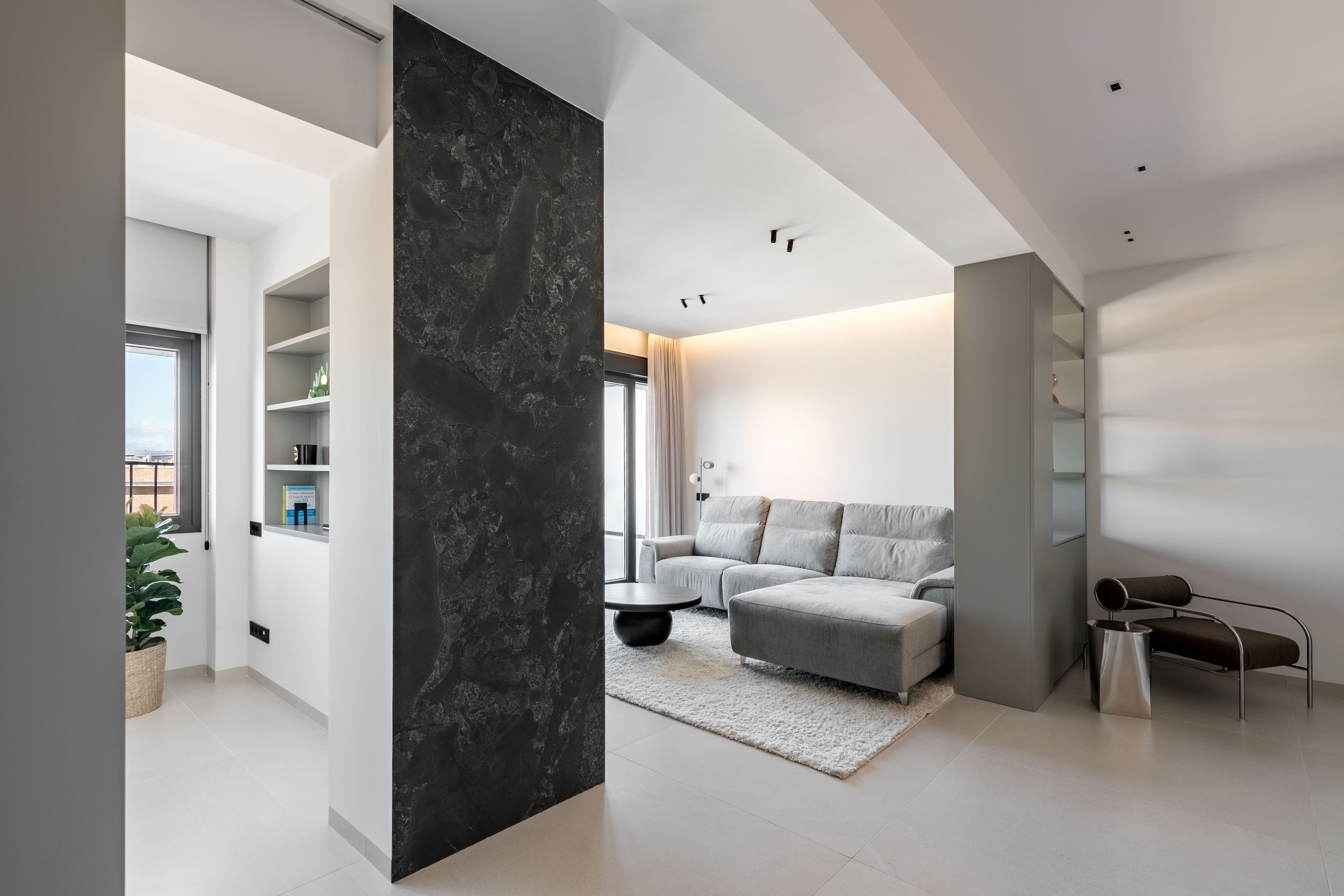 El interiorismo se apoya en materiales nobles y revestimientos de gran formato que refuerzan la sensación de amplitud. El pavimento porcelánico Cross Cut White de 120×120 cm de INALCO se extiende de forma continua por toda la vivienda, aportando uniformidad y luminosidad. En el salón, la pared de la zona de TV se reviste en Slate Grey, mientras que el dormitorio principal incorpora un elegante cabecero en Trevertino Vein White. Los baños combinan porcelánicos Pietra di Vals y Xtone Esmerald Green Polished, e incluyen espejos con iluminación frontal, mamparas de vidrio con perfilería minimalista y sistemas de extracción de aire ocultos en el techo. Además, se han empleado revestimientos de Porcelanosa, garantía de calidad y durabilidad.