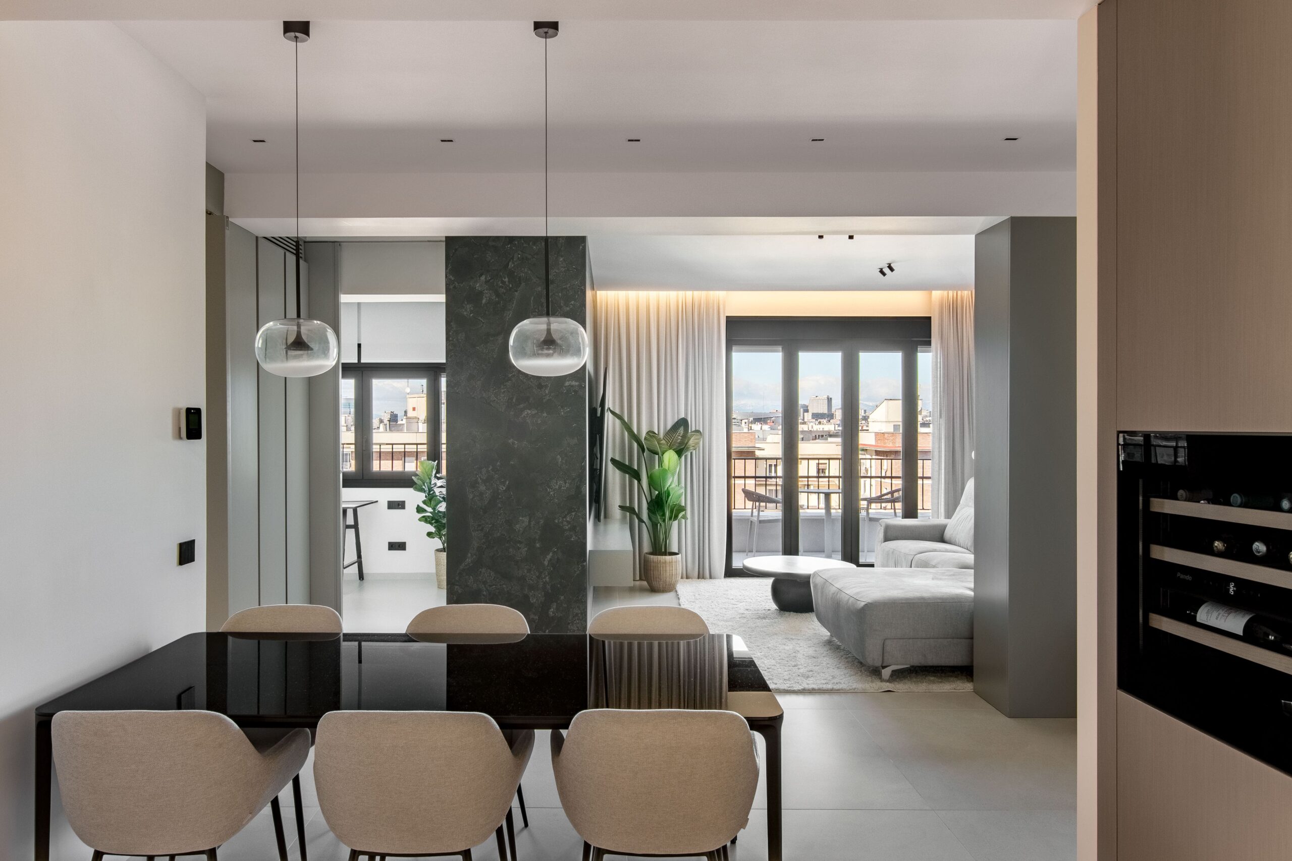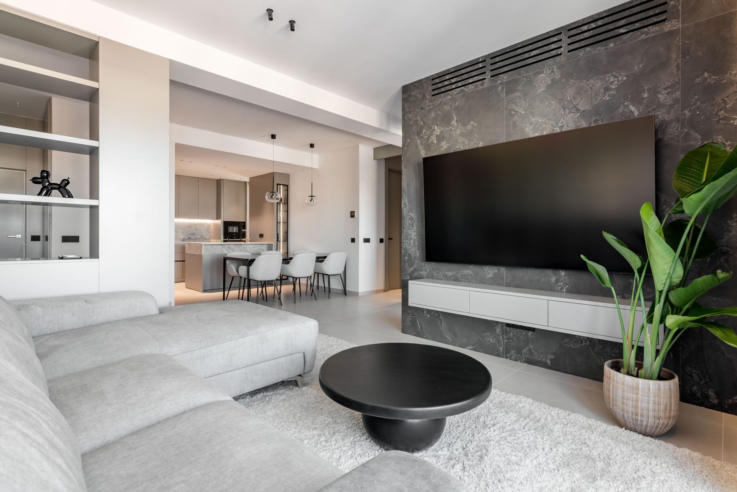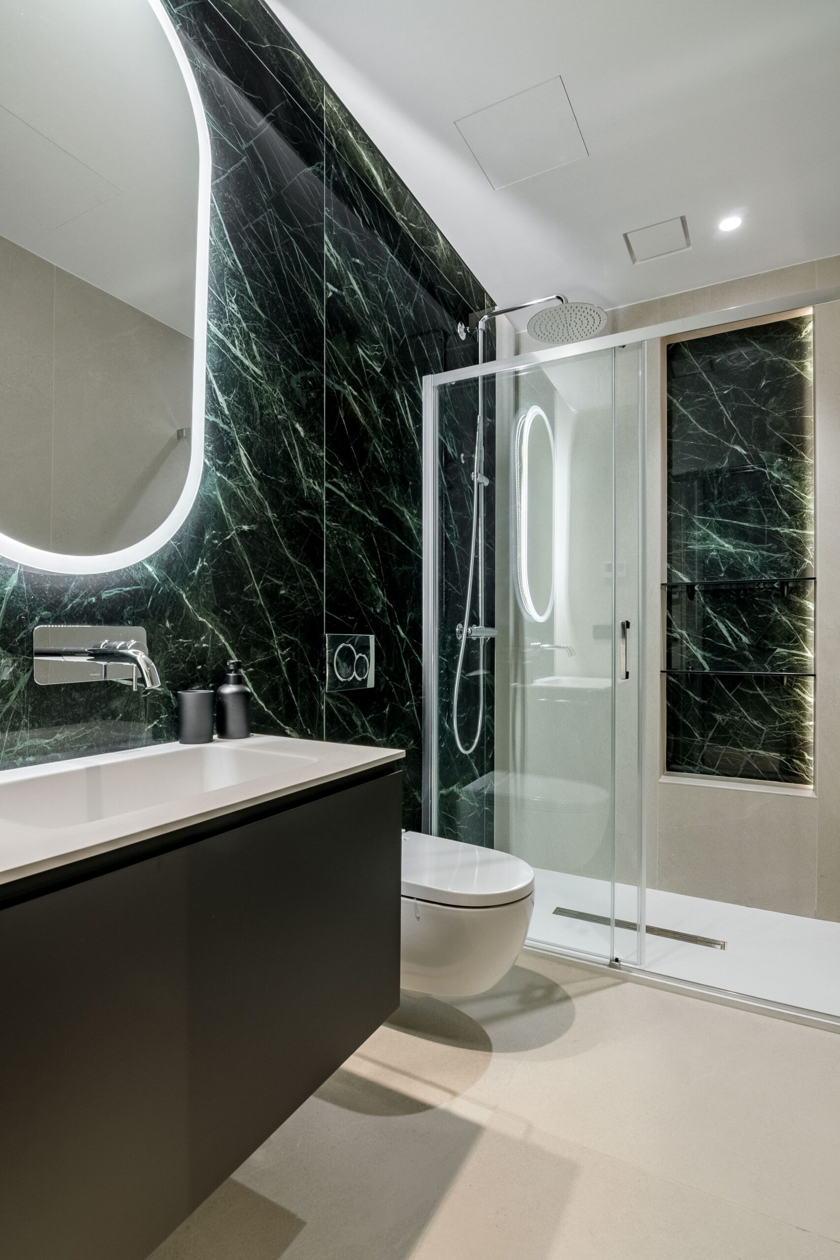 El interiorismo se apoya en materiales nobles y revestimientos de gran formato que refuerzan la sensación de amplitud. El pavimento porcelánico Cross Cut White de 120×120 cm de INALCO se extiende de forma continua por toda la vivienda, aportando uniformidad y luminosidad. En el salón, la pared de la zona de TV se reviste en Slate Grey, mientras que el dormitorio principal incorpora un elegante cabecero en Trevertino Vein White. Los baños combinan porcelánicos Pietra di Vals y Xtone Esmerald Green Polished, e incluyen espejos con iluminación frontal, mamparas de vidrio con perfilería minimalista y sistemas de extracción de aire ocultos en el techo. Además, se han empleado revestimientos de Porcelanosa, garantía de calidad y durabilidad.