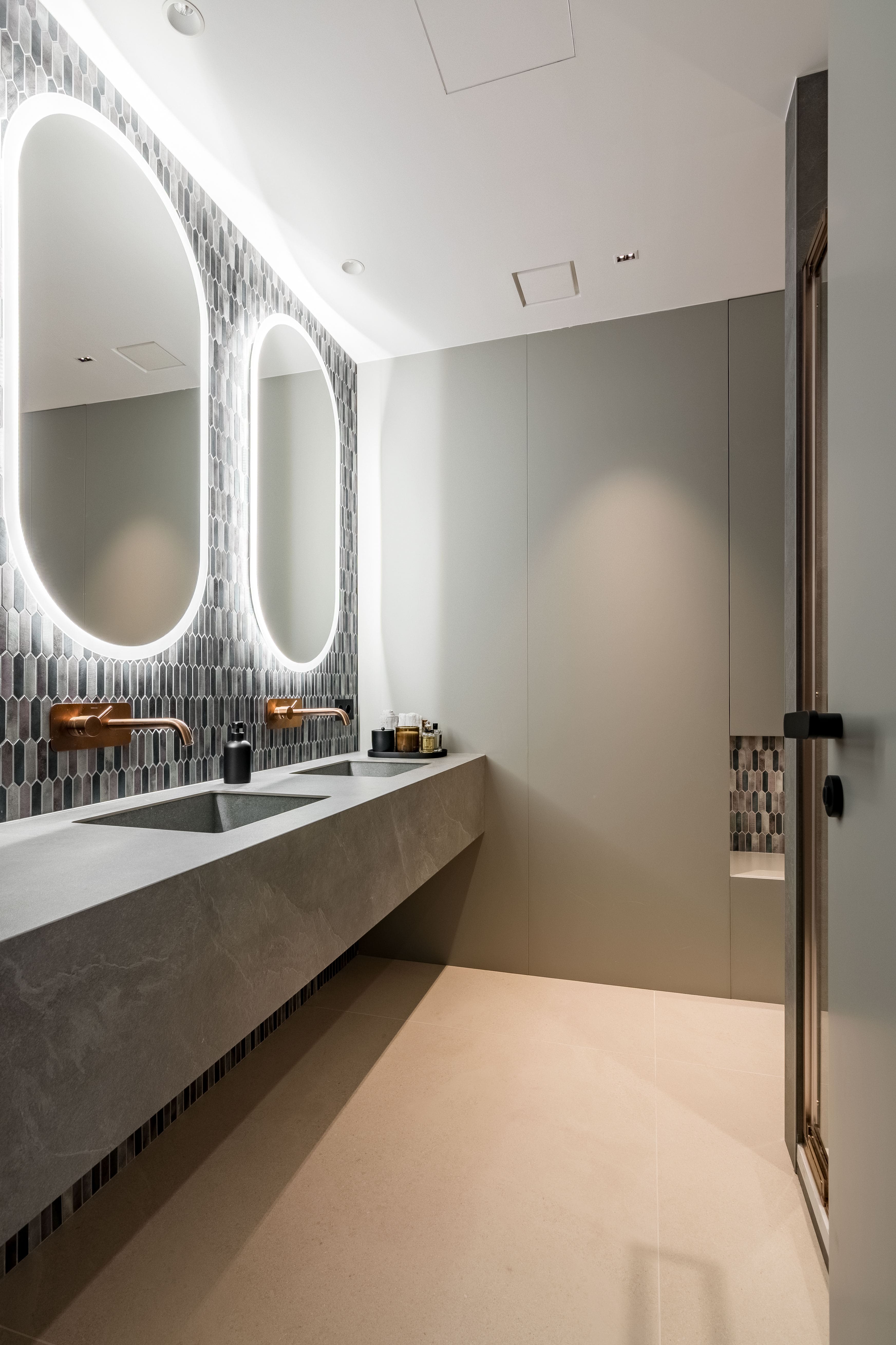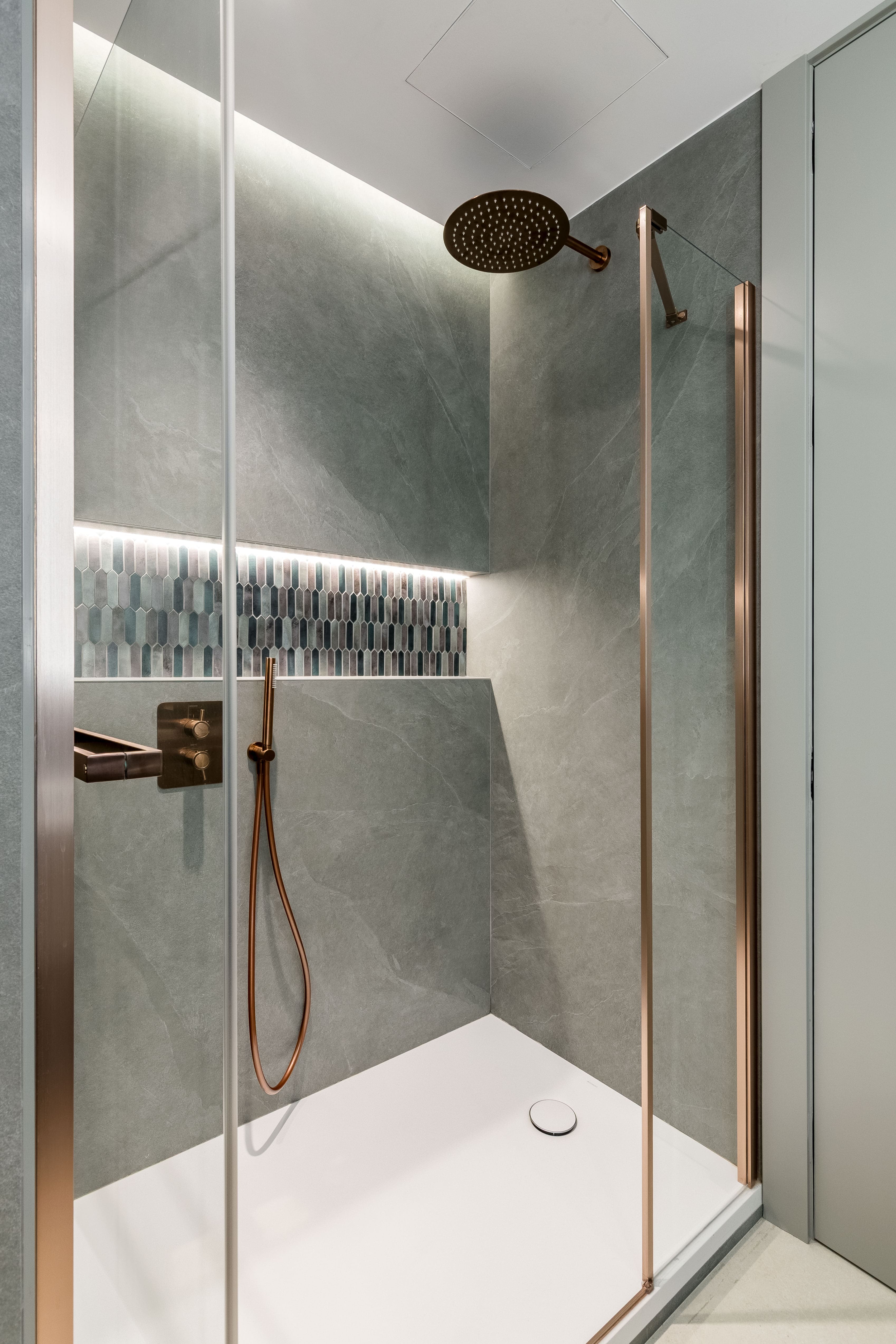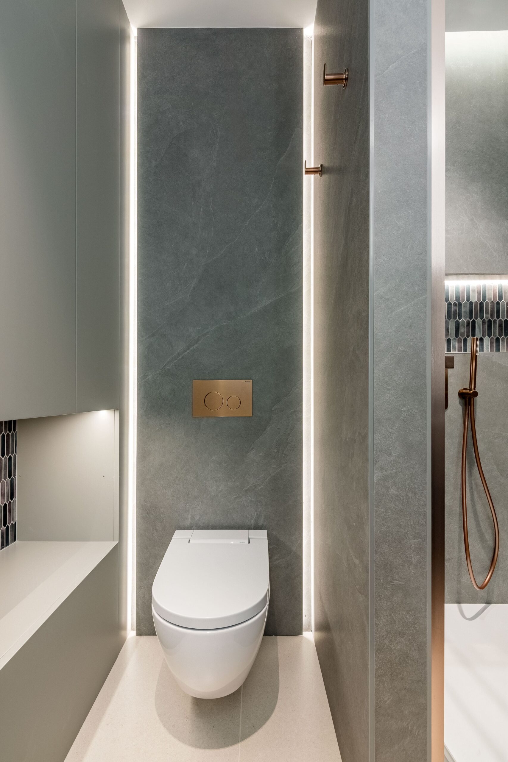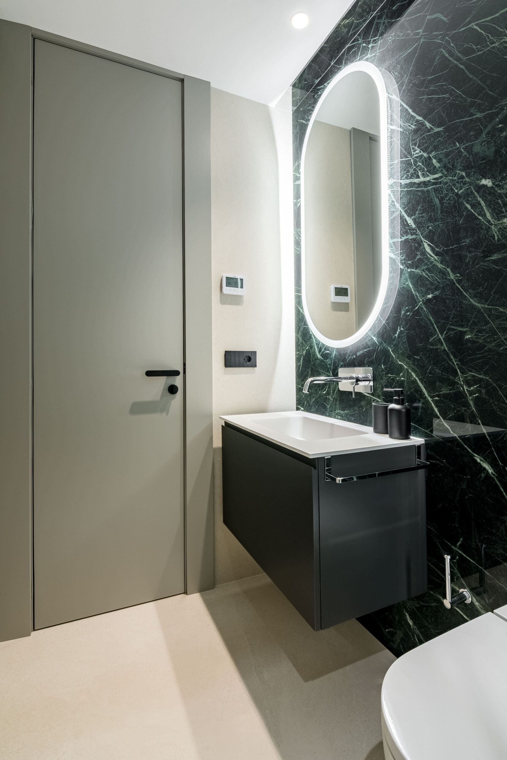 El interiorismo se apoya en materiales nobles y revestimientos de gran formato que refuerzan la sensación de amplitud. El pavimento porcelánico Cross Cut White de 120×120 cm de INALCO se extiende de forma continua por toda la vivienda, aportando uniformidad y luminosidad. En el salón, la pared de la zona de TV se reviste en Slate Grey, mientras que el dormitorio principal incorpora un elegante cabecero en Trevertino Vein White. Los baños combinan porcelánicos Pietra di Vals y Xtone Esmerald Green Polished, e incluyen espejos con iluminación frontal, mamparas de vidrio con perfilería minimalista y sistemas de extracción de aire ocultos en el techo. Además, se han empleado revestimientos de Porcelanosa, garantía de calidad y durabilidad.