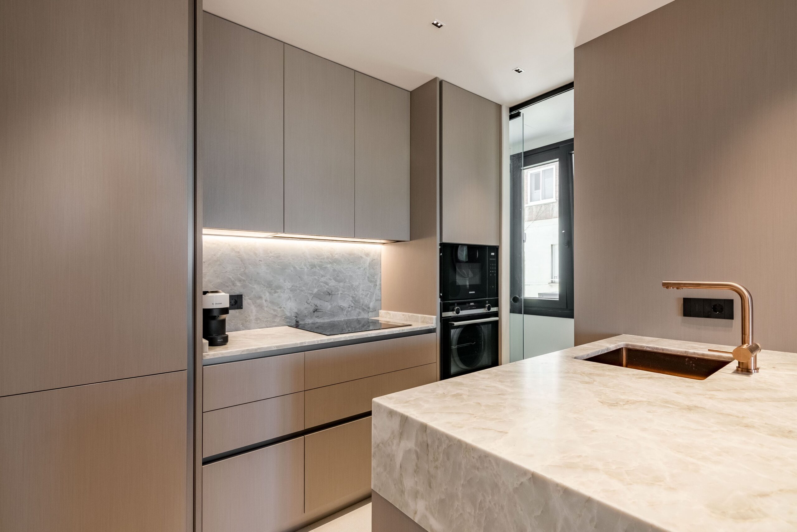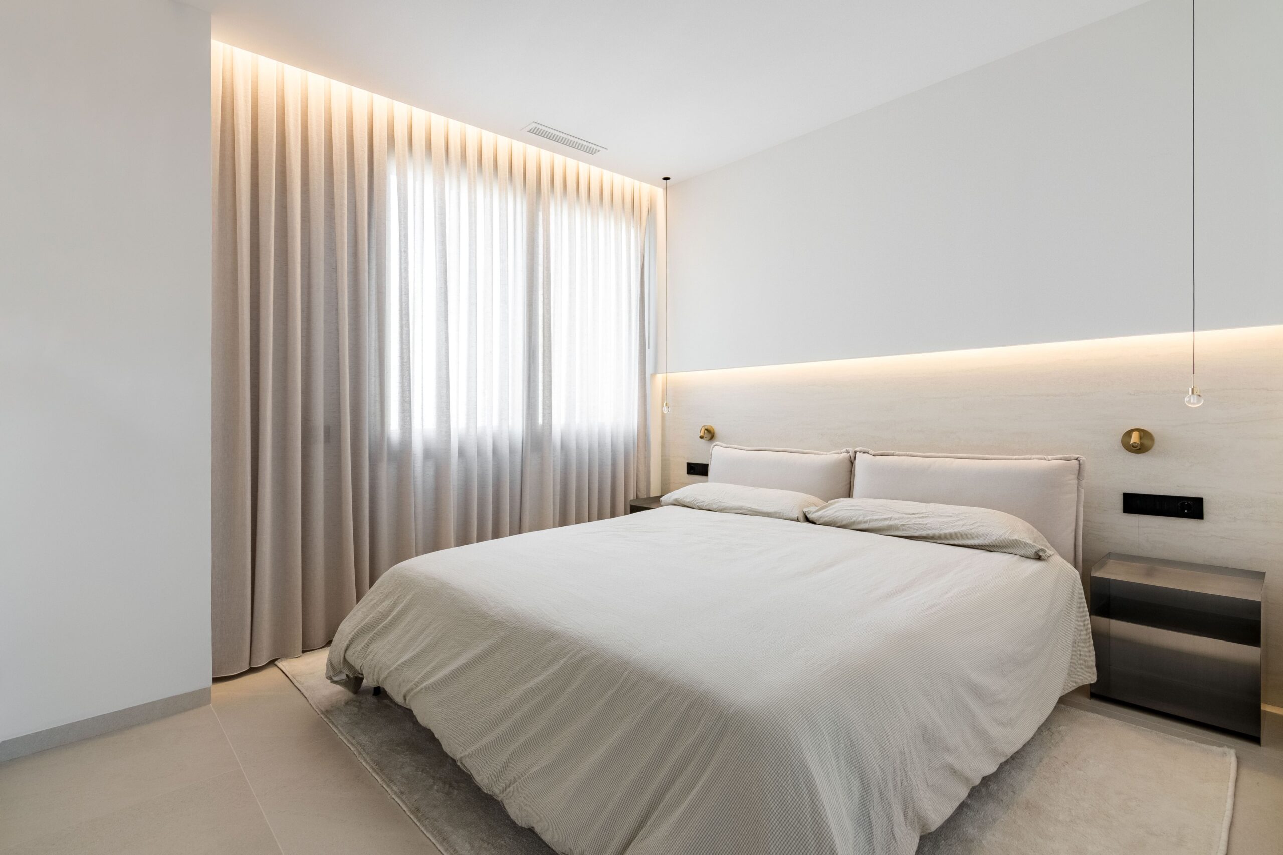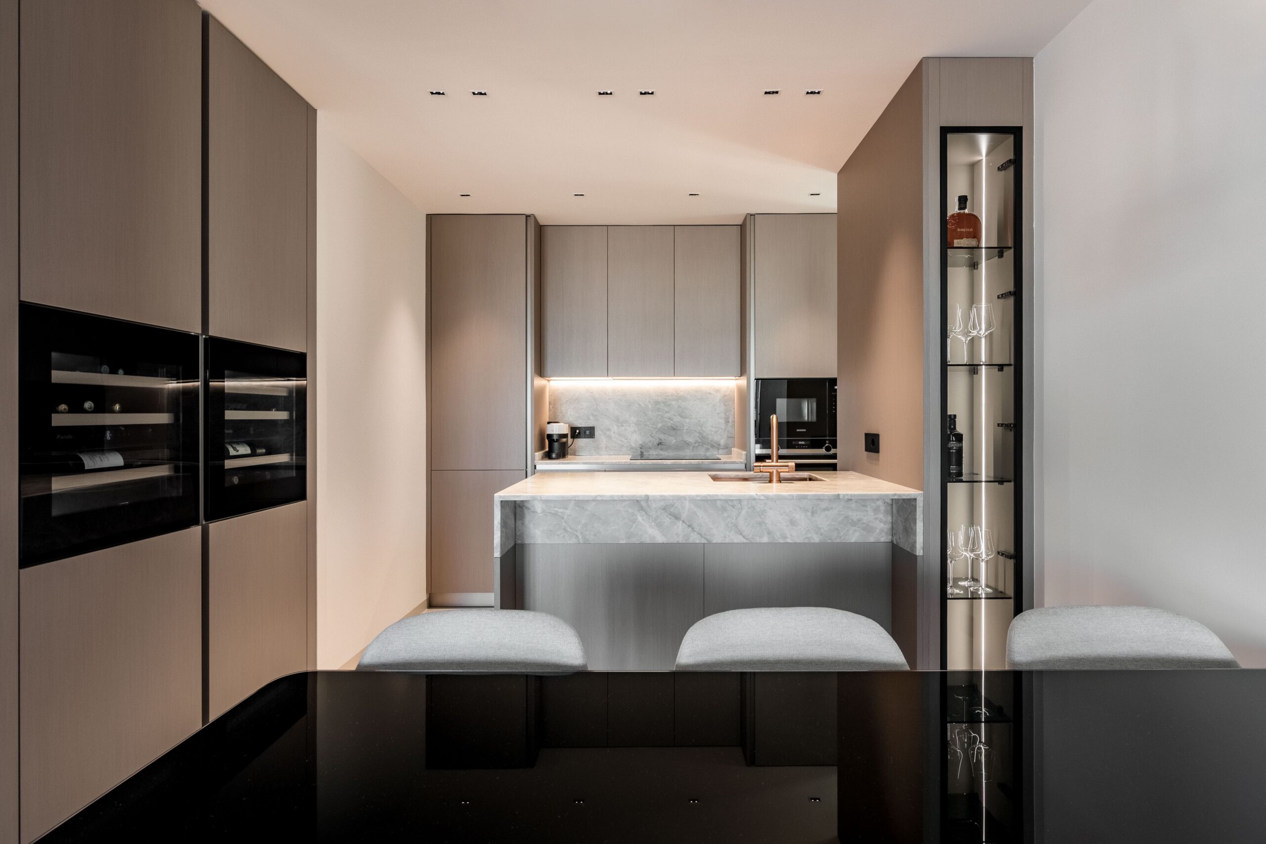 Cada detalle ha sido seleccionado para aportar calidad y distinción. Los baños cuentan con grifería Odisea en acabado cobre encastrado y sanitarios suspendidos de Geberit con tecnología avanzada. El proyecto lumínico ha sido desarrollado con soluciones de Leds Home Lighting, junto con piezas decorativas de Arkos Light (modelos Alaska y Cosmos) y luminarias técnicas de LEDS C4, complementadas con mecanismos de diseño de Bticino en acabado negro. Además, la vivienda incorpora sensores de apertura en armarios y tiras LED integradas que generan una iluminación ambiental indirecta elegante y funcional. La cocina, concebida como un espacio de diseño y alto rendimiento, dispone de encimera de cuarcita, electrodomésticos nuevos de Siemens y vinoteca.