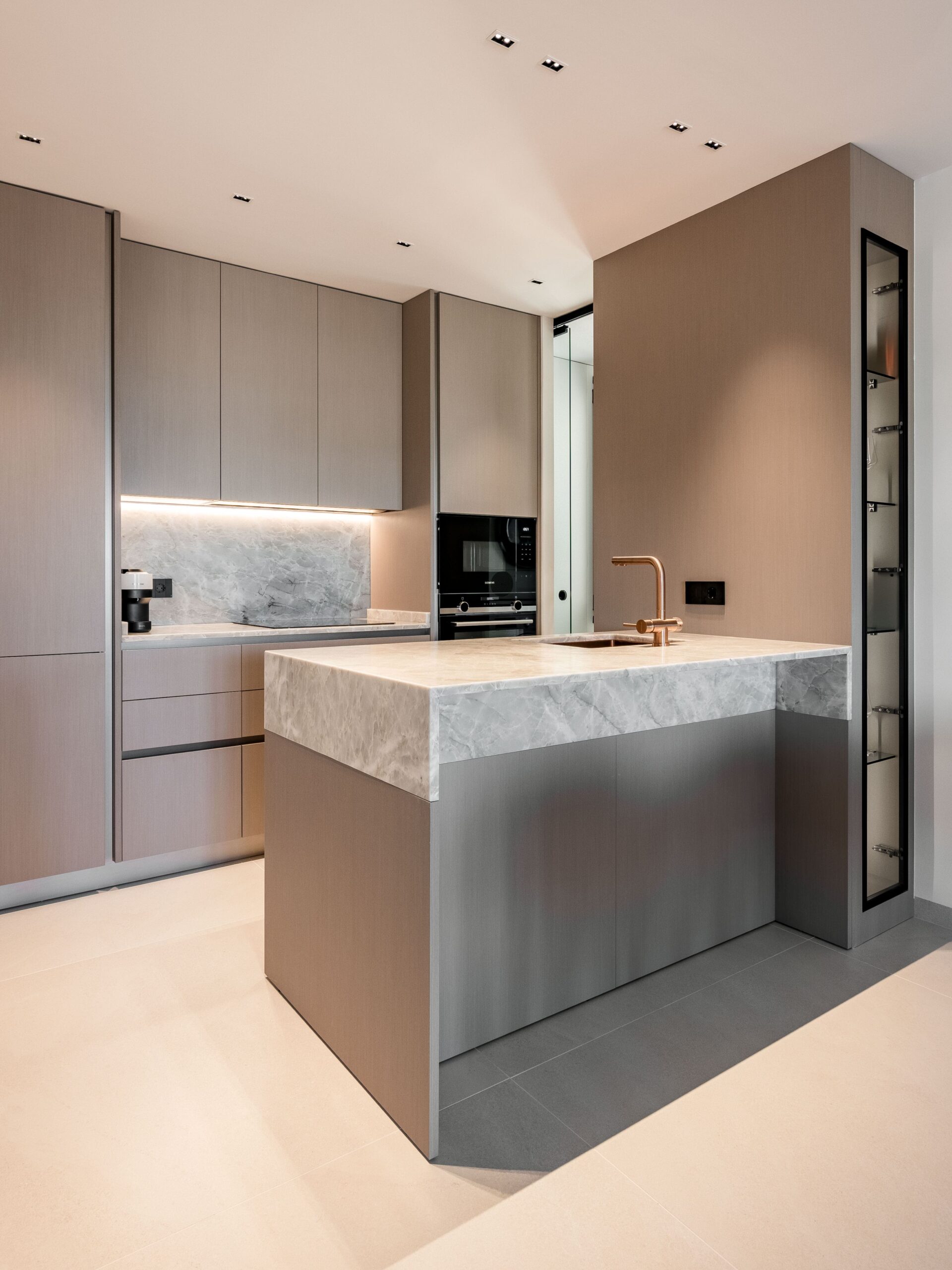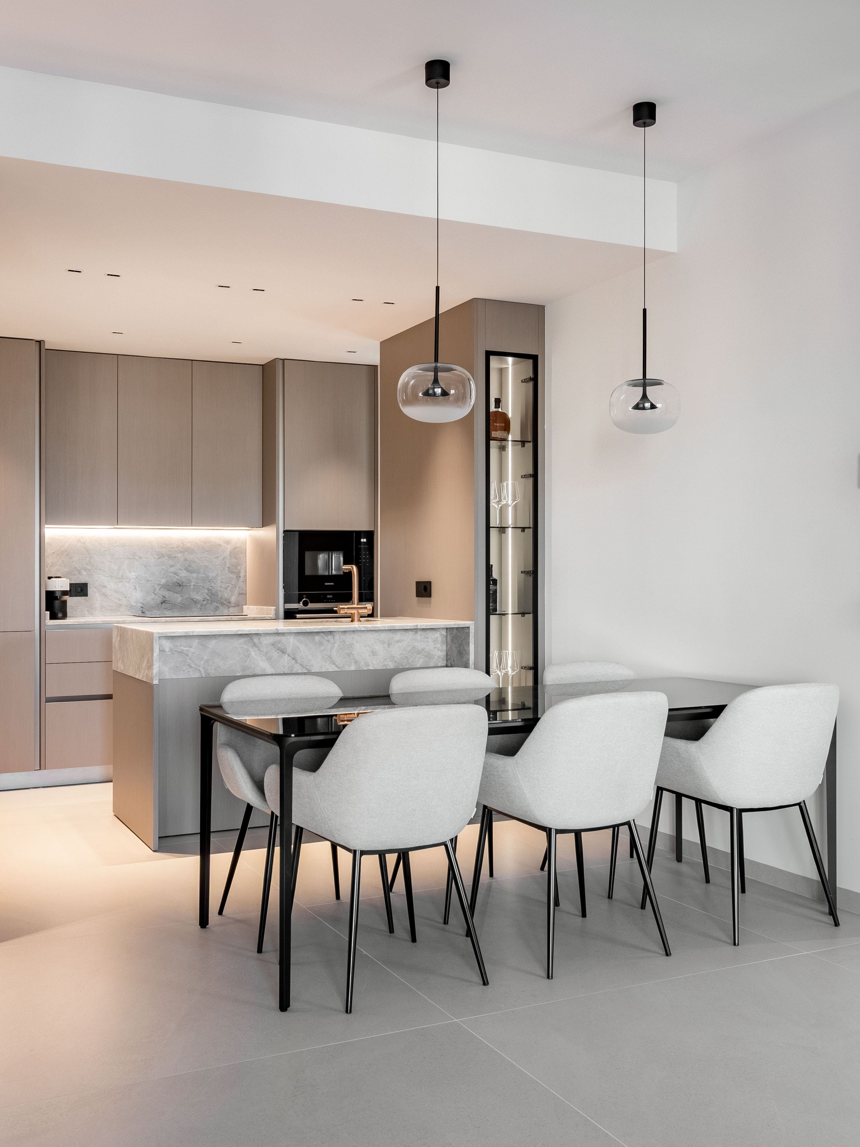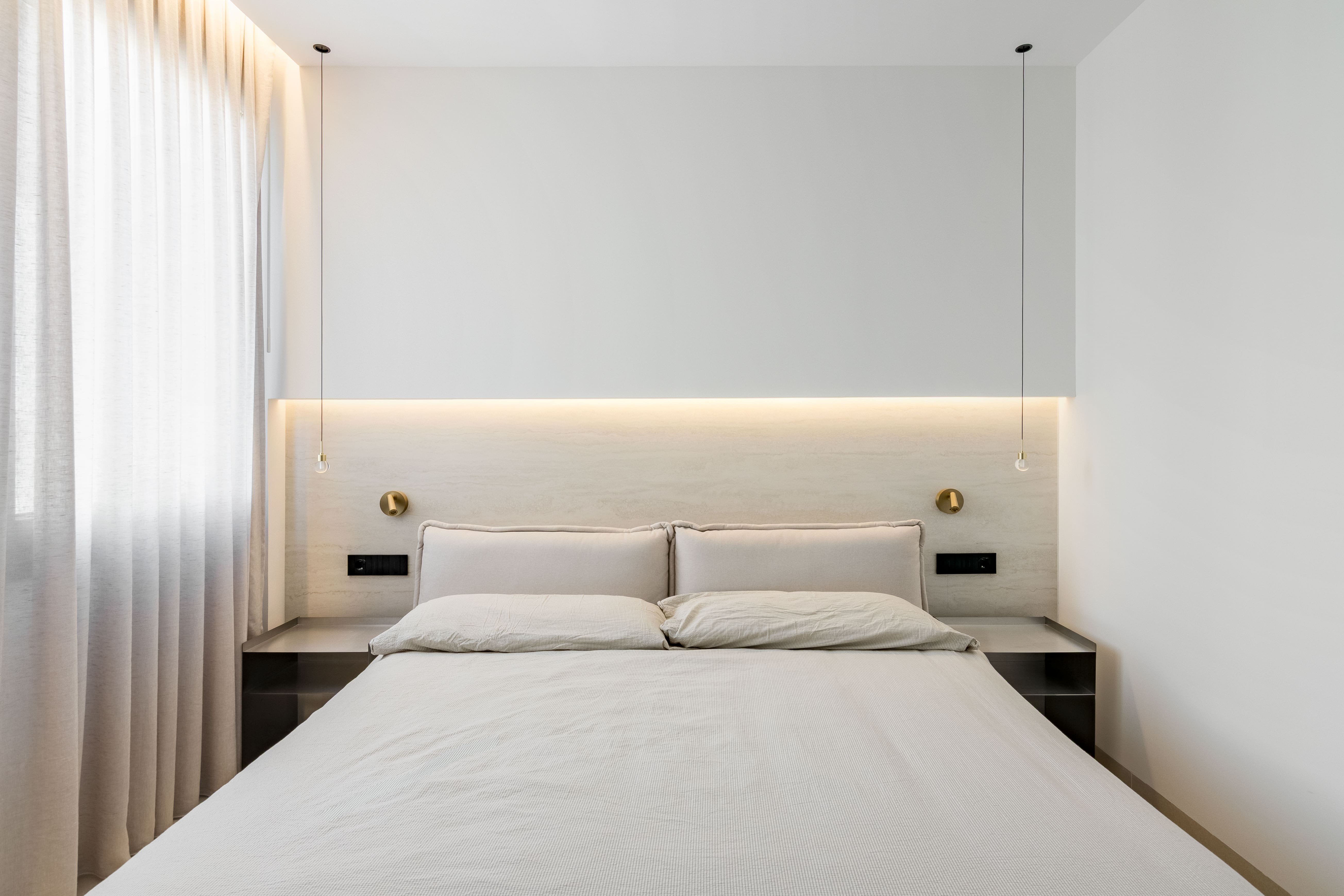 Cada detalle ha sido seleccionado para aportar calidad y distinción. Los baños cuentan con grifería Odisea en acabado cobre encastrado y sanitarios suspendidos de Geberit con tecnología avanzada. El proyecto lumínico ha sido desarrollado con soluciones de Leds Home Lighting, junto con piezas decorativas de Arkos Light (modelos Alaska y Cosmos) y luminarias técnicas de LEDS C4, complementadas con mecanismos de diseño de Bticino en acabado negro. Además, la vivienda incorpora sensores de apertura en armarios y tiras LED integradas que generan una iluminación ambiental indirecta elegante y funcional. La cocina, concebida como un espacio de diseño y alto rendimiento, dispone de encimera de cuarcita, electrodomésticos nuevos de Siemens y vinoteca.