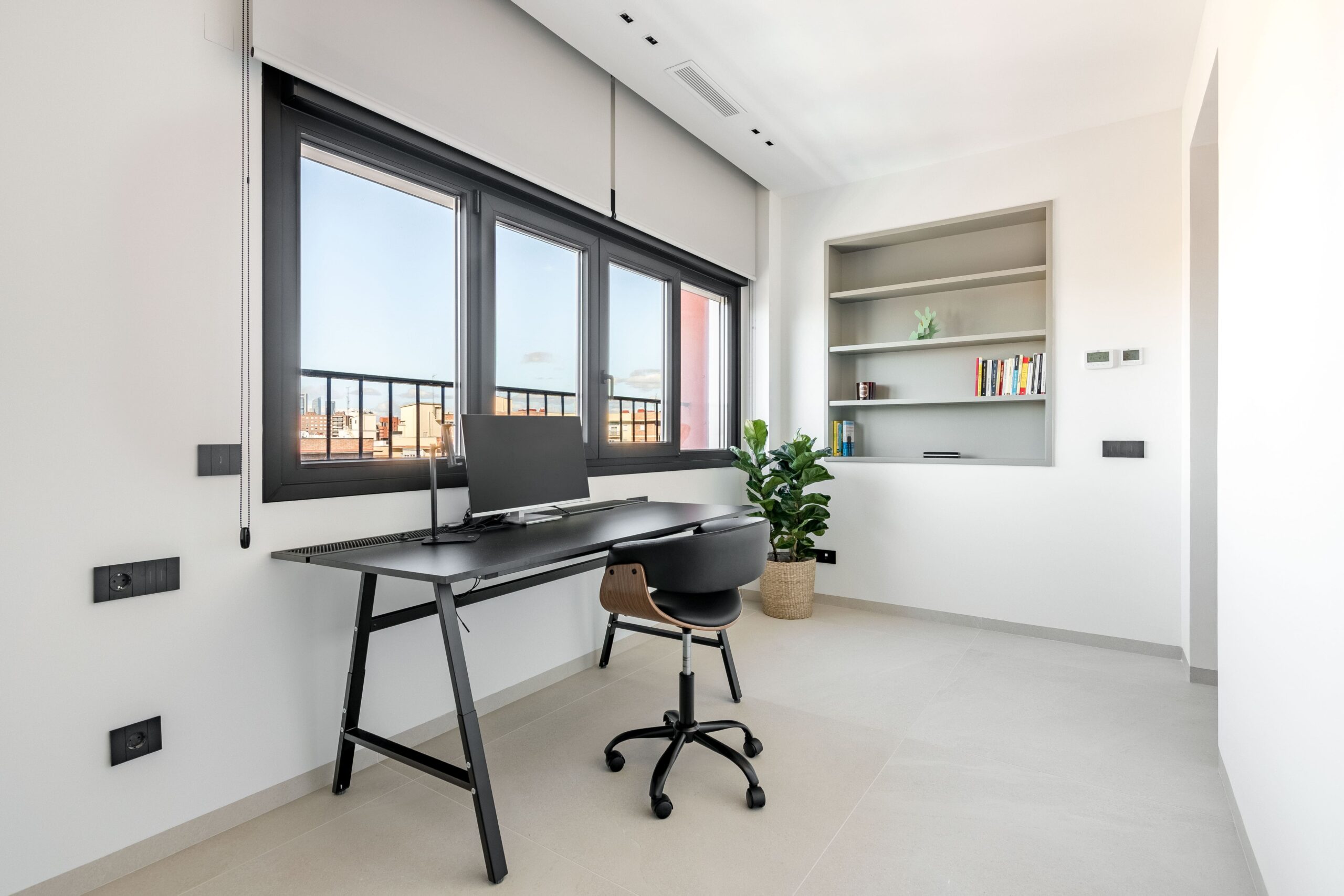 La vivienda ha sido equipada con un avanzado sistema de aerotermia Saunier Duval Genia Set Tek 8, que gestiona tanto la climatización como el agua caliente sanitaria con máxima eficiencia energética. El confort está asegurado durante todo el año gracias al suelo radiante en invierno y al sistema de aire por conductos con fancoils en verano. La carpintería exterior de Schüco con vidrios de control solar proporciona un excelente aislamiento térmico y acústico, optimizando el consumo energético y el bienestar interior.